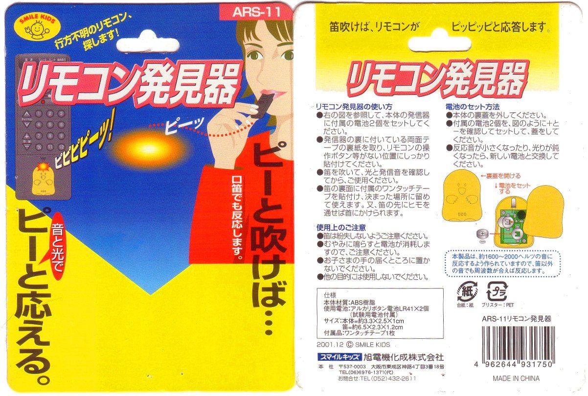 2004年ごろ、東京駅八重洲地下街にまだ存在していたアイディアグッズの店「王様のアイディア」で「リモコン発見器」というネーミングの商品を購入した。付属の笛を吹くと小さな本体が音と光で反応するというもの。