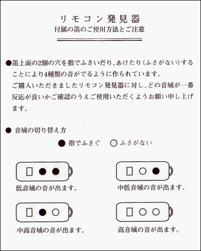 「本製品は、約1600〜2000ヘルツの音に反応するよう作られていますので、笛以外の音でも周波数が合えば反応します」