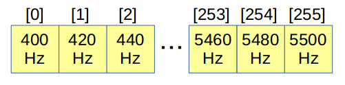 効率を改善するために伝達する情報の内容に手を加えることにしました。1バイト分のキャラクタデータをビットごとに 0,1 を表わすふたつの周波数の波の羅列で表現するのではなく、256種類の周波数を用いて直接 0x00 〜 0xFF を表現する形にすれば理論上伝送効率が 8倍向上するはずです。これを具体化してみることにします。