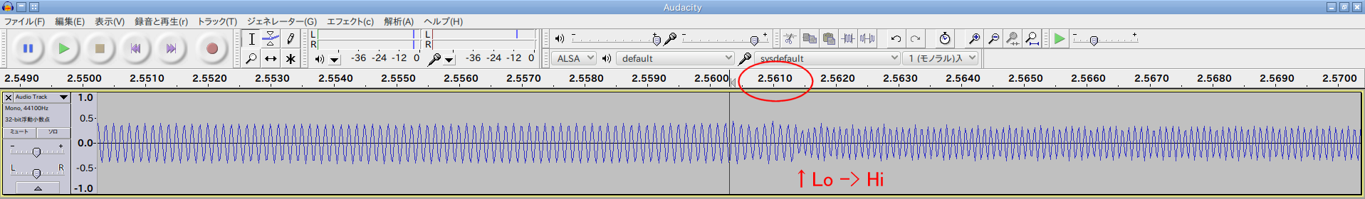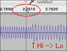 信号中の Lo(8000Hz)から Hi(10000Hz)、Hi から Lo への切り替え部分の波形の確認を行いました。