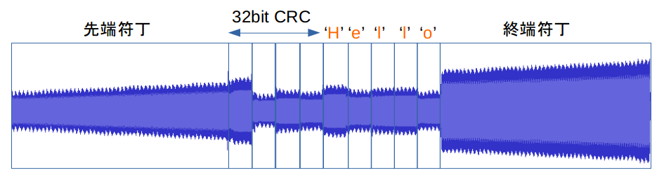 - 送信側は先端符丁とデータ本体の間にデータの 32ビット CRC 計算結果(java.util.zip.CRC32 使用)を 4 * 100ミリ秒間発信する