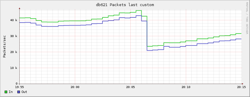 ちょうどこの設定が漏れていて、S-in後にこの設定を反映させた事があったので、その時の Ganglia のグラフを紹介しておきます。S-in直後で無駄なクエリをたくさん実行している状態だったので、理論上最大値である 1/2 のパケット数削減ができています。(全体的に右肩上がりなのは、どんどんアクセスが増えている時間帯だからです)